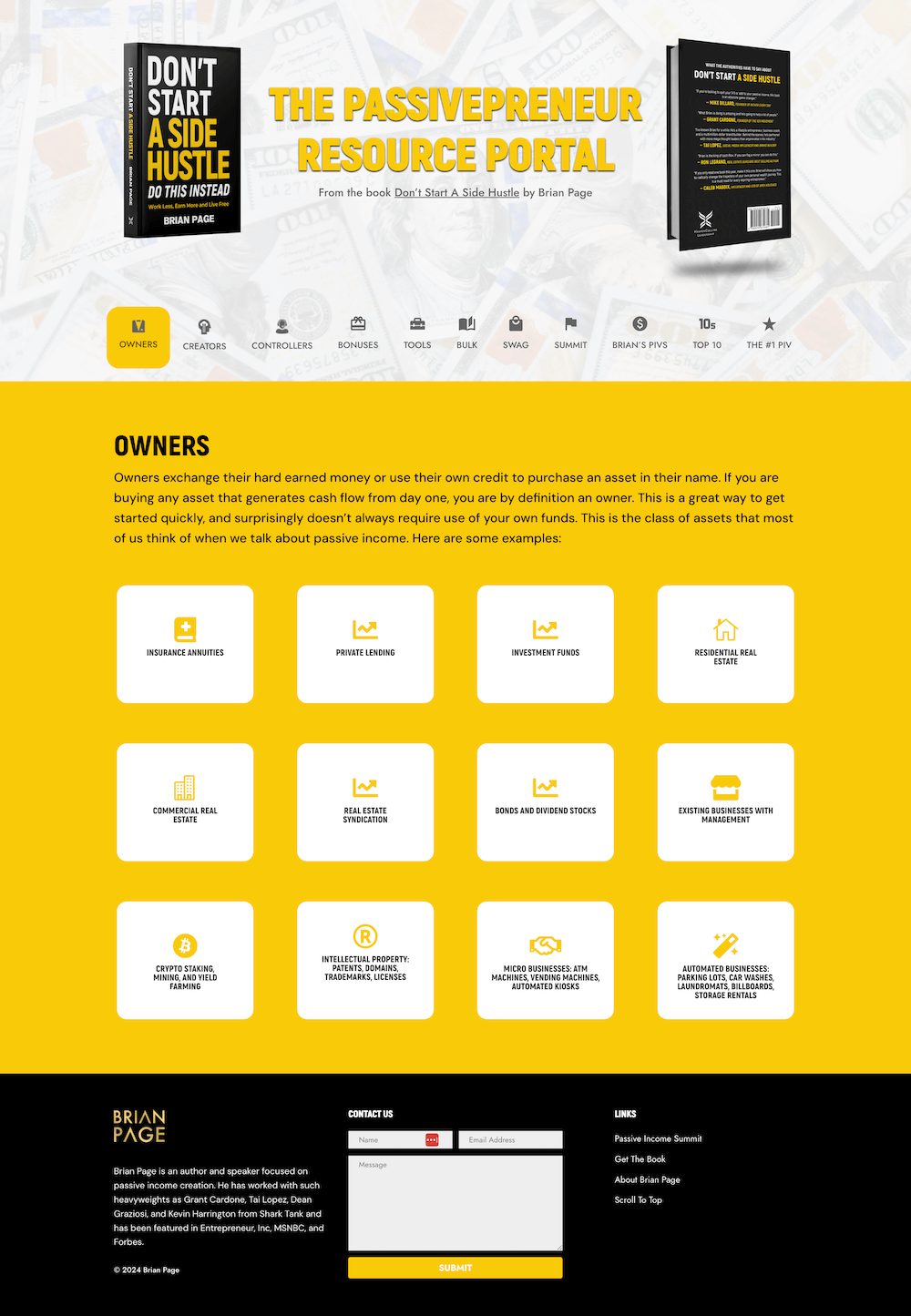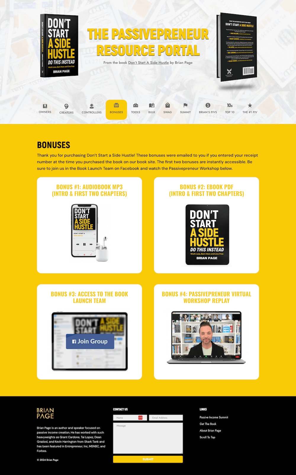 Create a custom website to showcase Brian Page’s book Don’t Start A Side Hustle, including supporting resources, tools, and content aligned with the book’s message. The site needed to be highly customized to reflect Brian’s vision and branding.